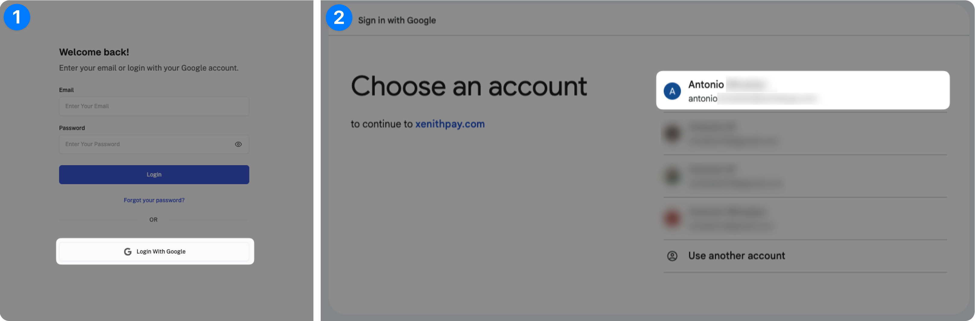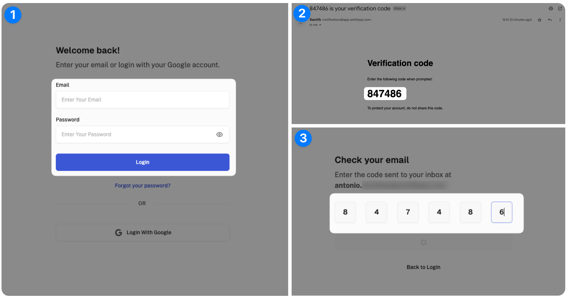 Using Credentials: Log in using your registered email and password. Xenith sends a one-time password (OTP) to your registered email for each login attempt, ensuring that only authorized users can access your account.