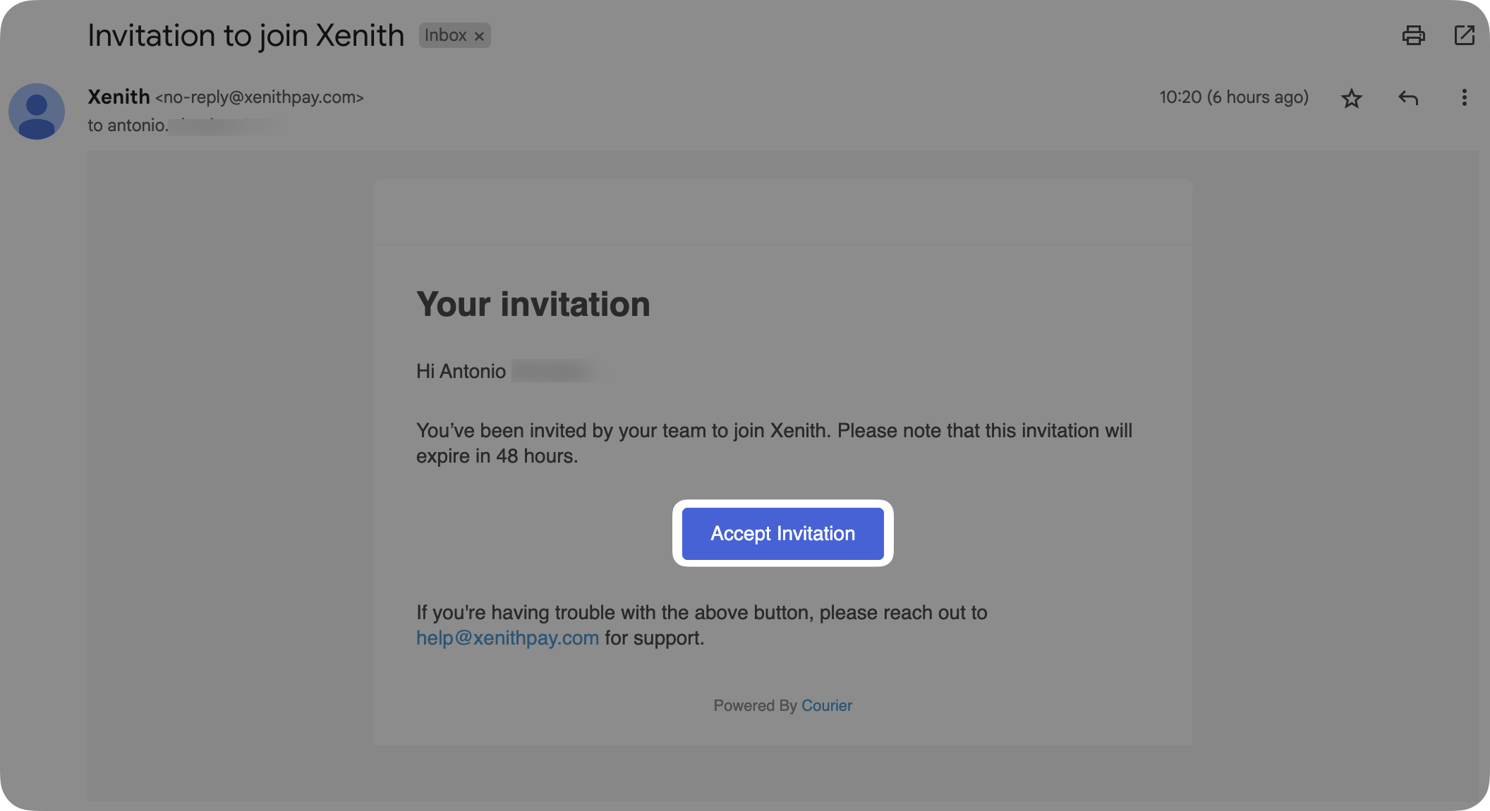 Email Invitation: You should have received an email from Xenith with a link to set up your account. Click on the "Accept Invitation" button and you will be directed to the set up page. Note: the link will expire in 48 hours.
