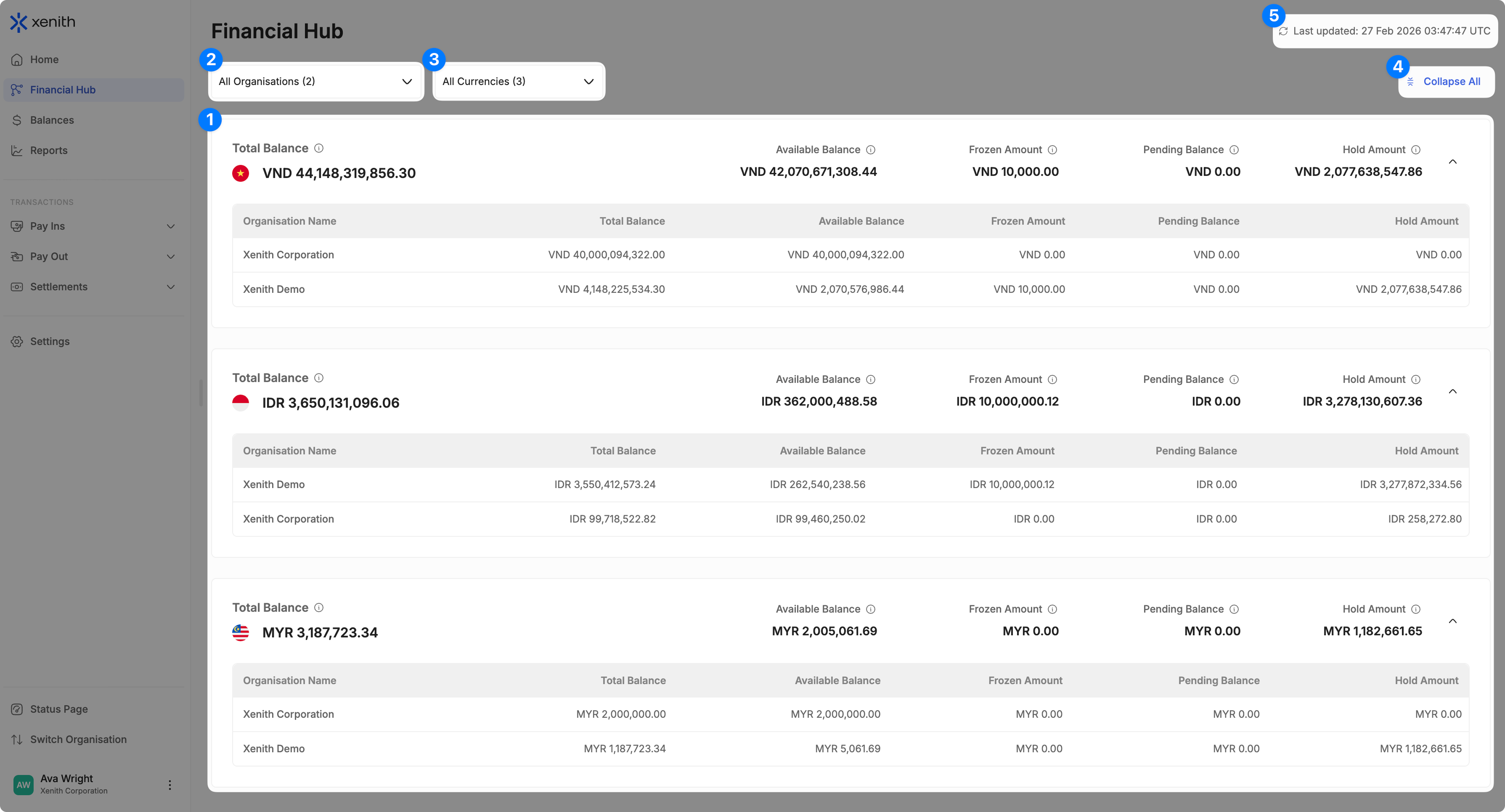 The Financial Hub is a centralized dashboard that allows you to view aggregated balances across multiple organisations within an Organisation Grouping. It provides a consolidated view of balances by payment currency in one place.