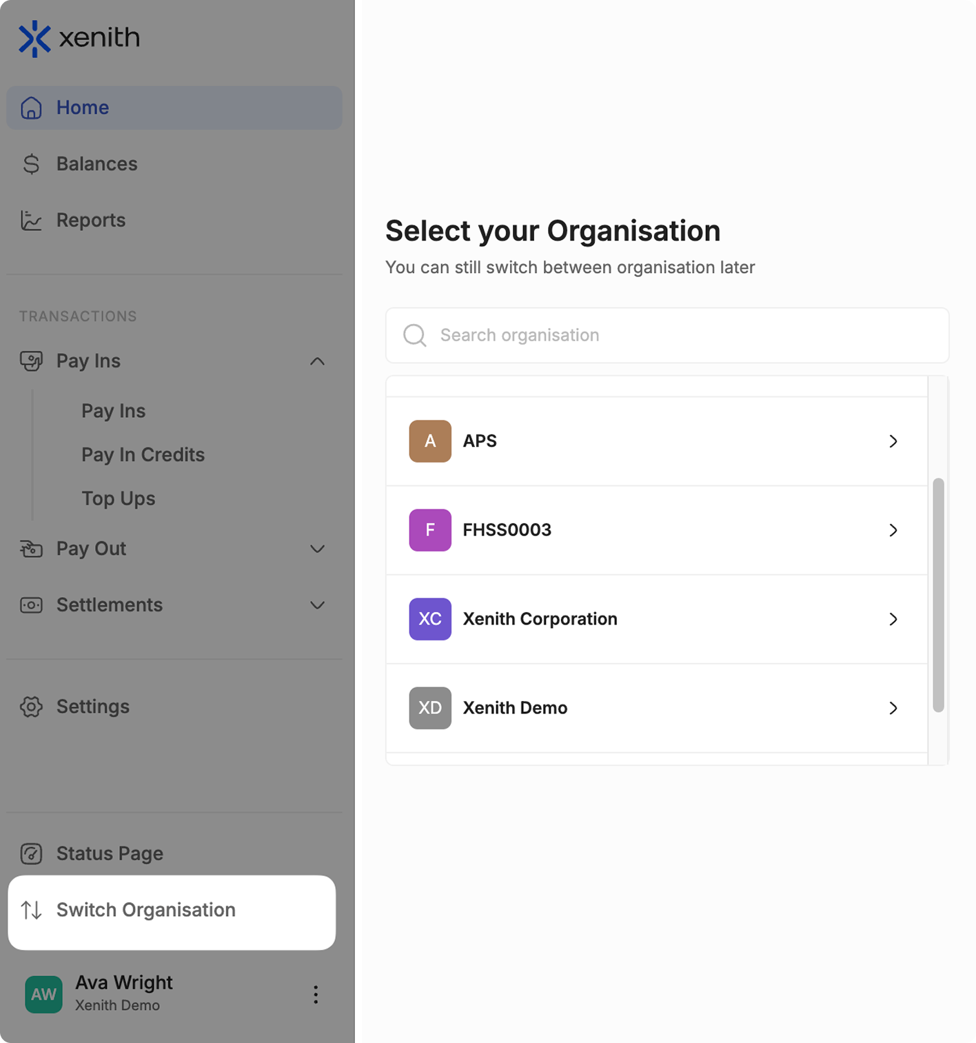 In Xenith, each organisation represents a distinct merchant account with its own data, configurations, balances, and access permissions. This structure ensures secure separation between different business entities or operational setups within the platform.