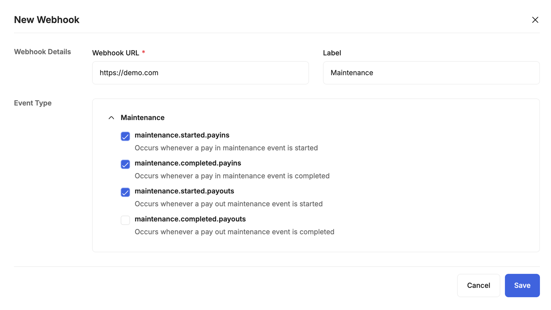 Fill out the form by entering your destination Webhook URL and selecting the events you want to receive.