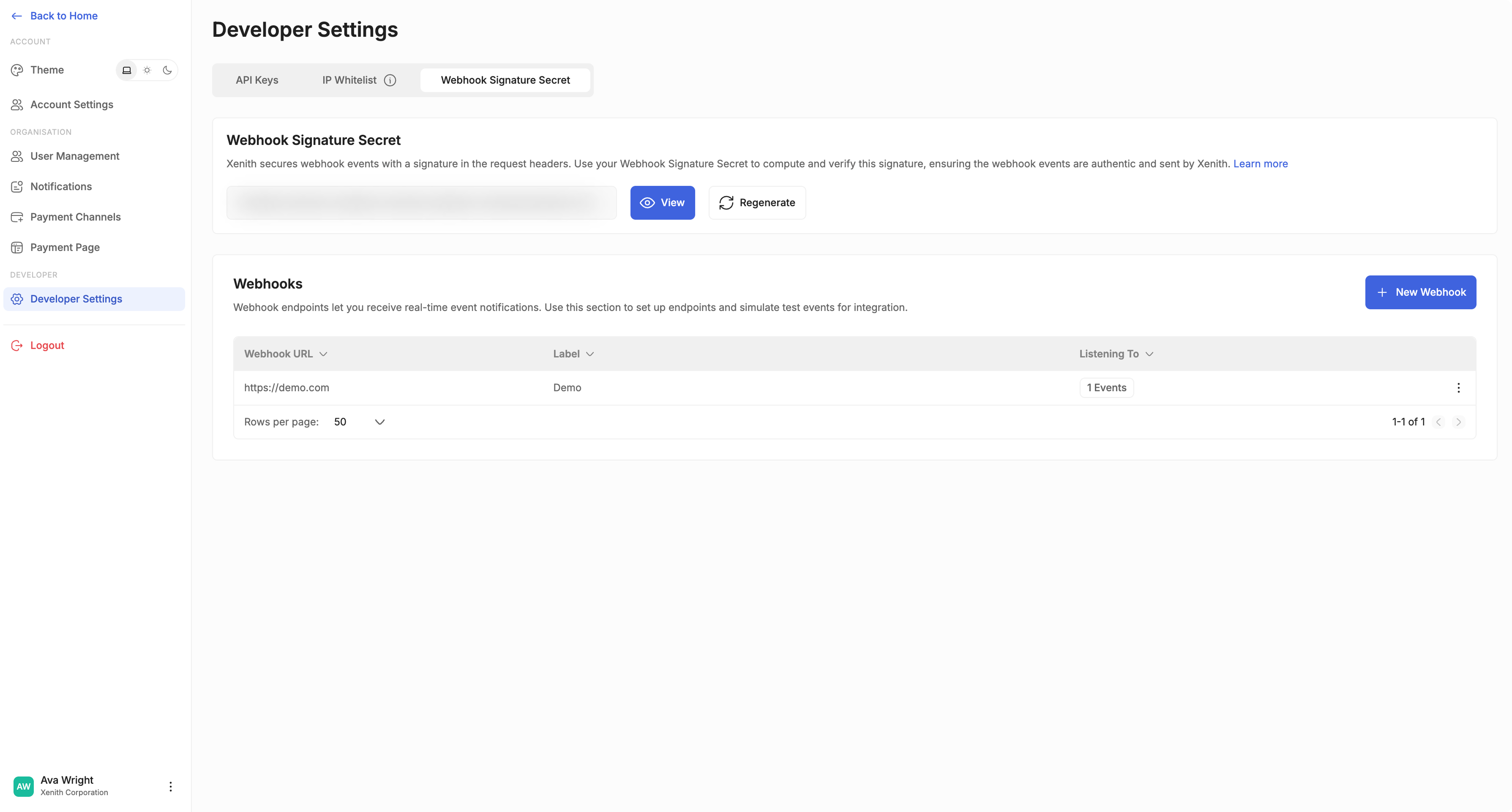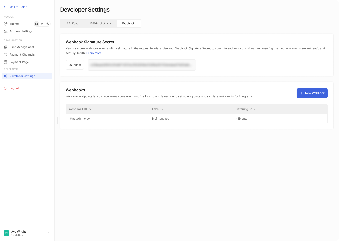 - Webhook Signature Secret: a security key used to verify that incoming webhook events truly come from Xenith (authenticity check).