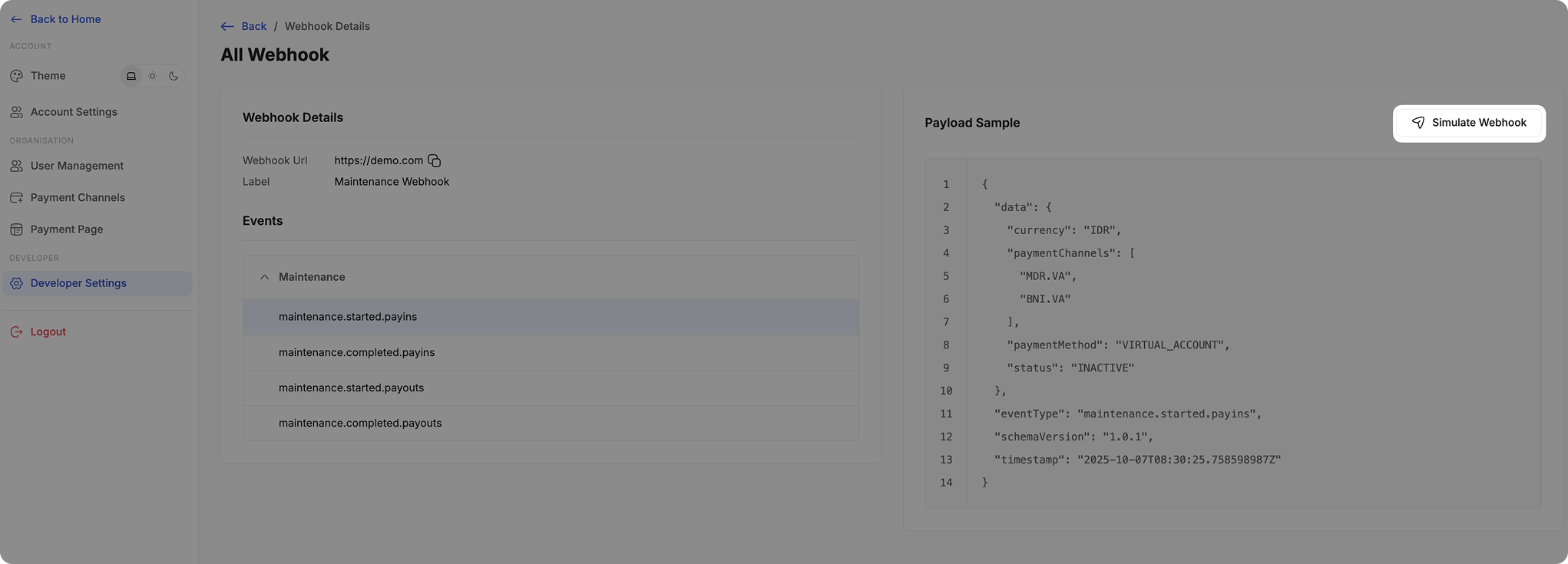 Click Simulate Webhook to send a test payload to your configured Webhook URL.